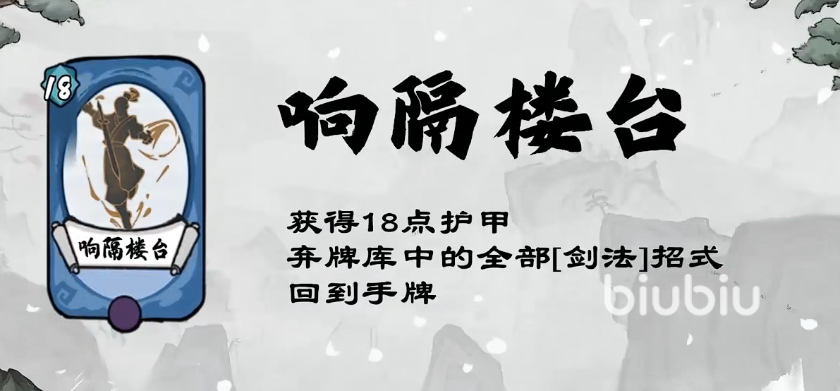 构筑方面,主要以山外清音,箫史乘龙,这些可以主打抽牌的技能招式为主要构筑。虽然这些招式的基础数值方面不是特别高,普遍只有十几点,甚至不到20点,但大多可以额外再打一抽一,这可以让我们每回合的手牌数量都相当充足。此外,也非常推荐在快件流构筑中加一张响阁楼台,很不错的一张卡牌,获得18点护甲,同时将弃牌库所有的剑法招式再回到手牌。这已经不能说是一换几了,那直接资源血赚好不好。因此,对于这个流派,也无论什么样的敌人,都非常好用。