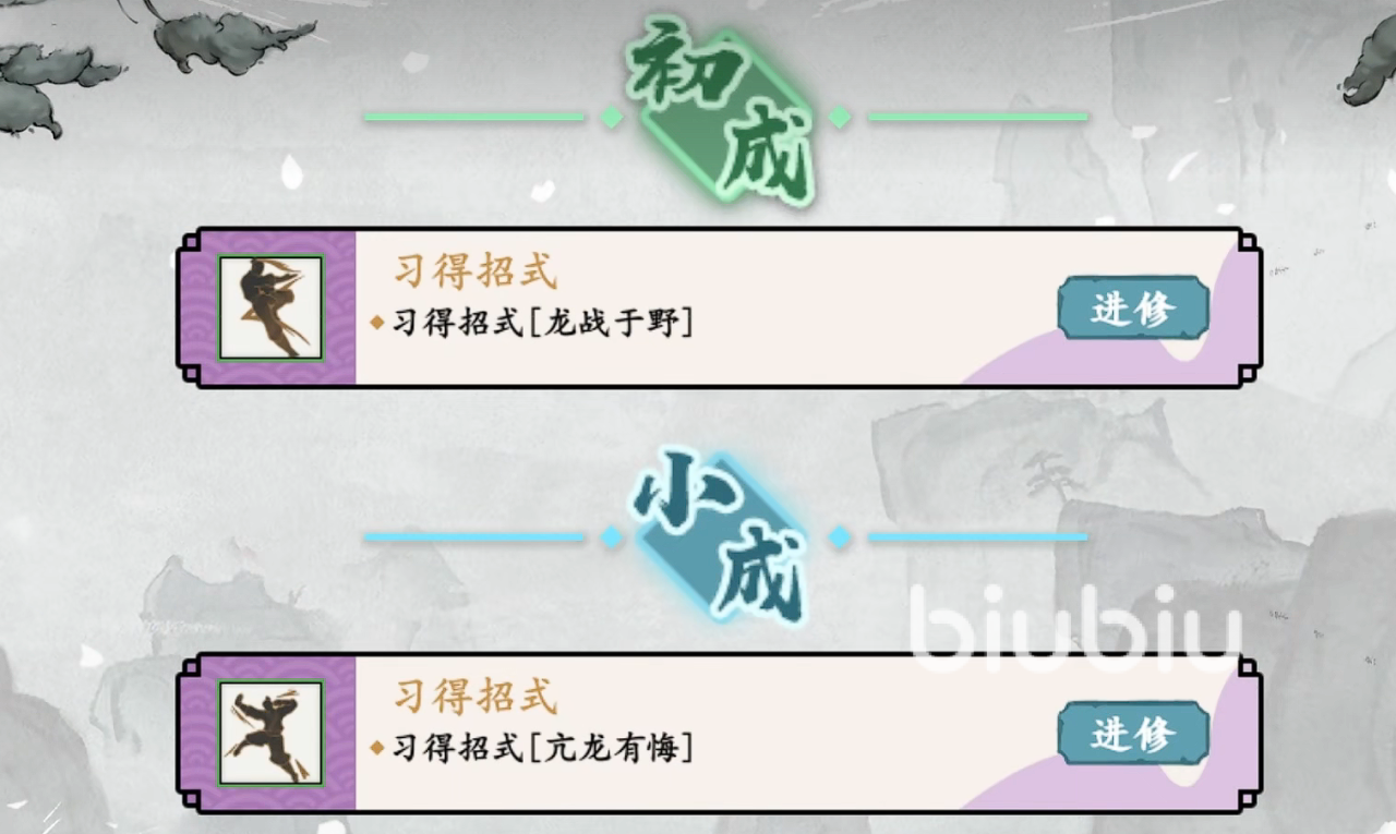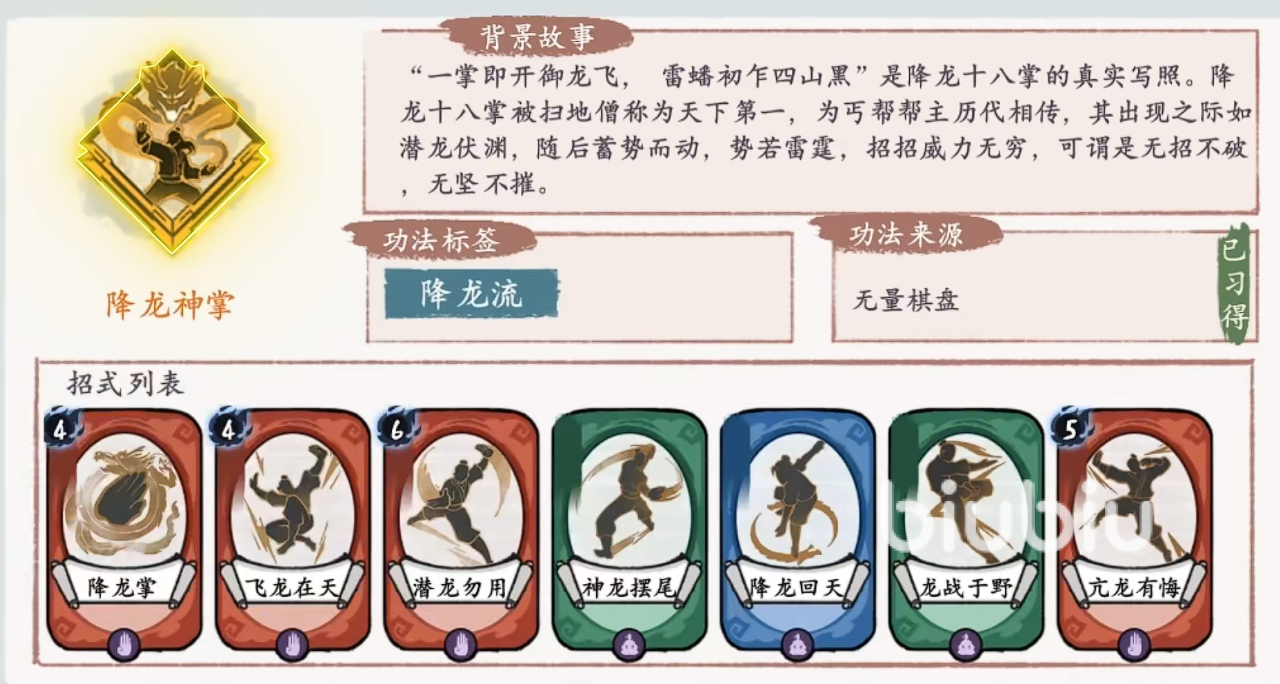 在实际对局过程当中,非常在建议将龙战于野和降龙亢龙有悔这两个学了。这两个分别是功法初成和小成阶段可以进修的招式技能,在实际对局环境中特别有用。特别是龙战于野,在开始时候可以获得n张降龙掌作为基础。虽然几率不太稳定,但效果很棒。