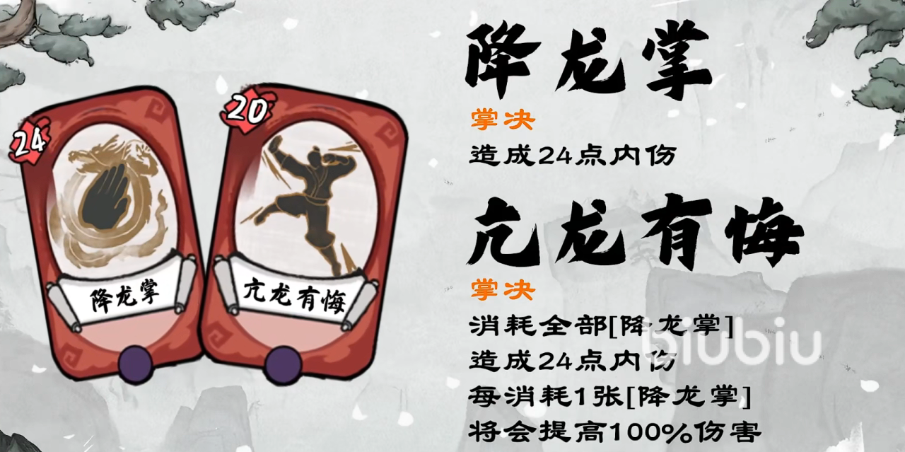 大招亢龙有悔,基础伤害不高,但可以累加伤害。消耗全部的降龙掌没造成24点内伤,而且每额外多消耗一张降龙掌,将额外提升100%的伤害。