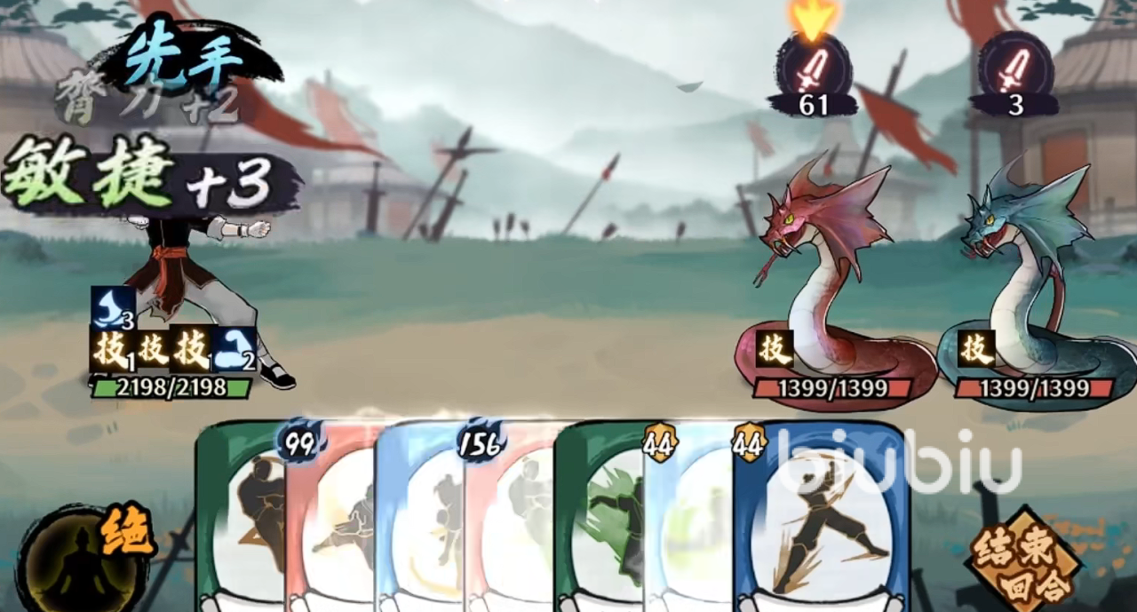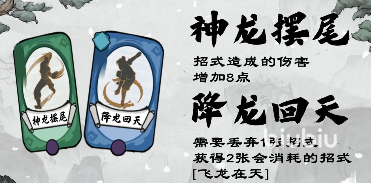 辅助卡牌,神龙摆尾和降龙回天。神龙摆尾,没什么好说的,就是给玩家们增加额外的伤害而已,可以对玩家们招式造成的伤害,提升八点,要累积使用。主要还是降龙回天,需要丢弃一张招式,然后获得两招会消耗的招式的飞龙在天。经典的弃一抽二,可以帮助玩家们能够更快的进行运转。在开局没有飞龙在天的情况下,降龙回天能帮助玩家们进行招式的补充。