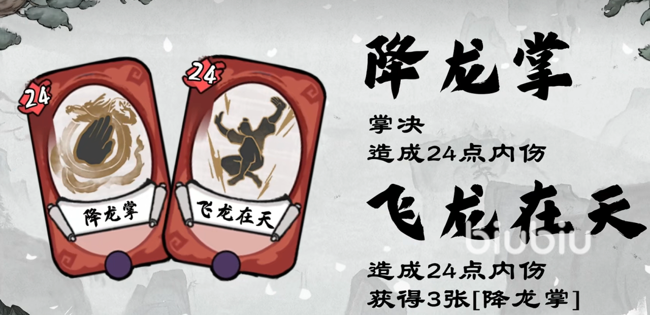 飞龙在天,这个卡牌效果为对敌人造成24点内伤的同时获得额外三张降龙掌。虽然是单体供需,但额外获得了三张降龙掌,每一张降龙掌都可以再造成24点伤害,相当于一换三,绝对血赚。只要该回合能打出来,那么完全不愁自己的输出卡牌不够。