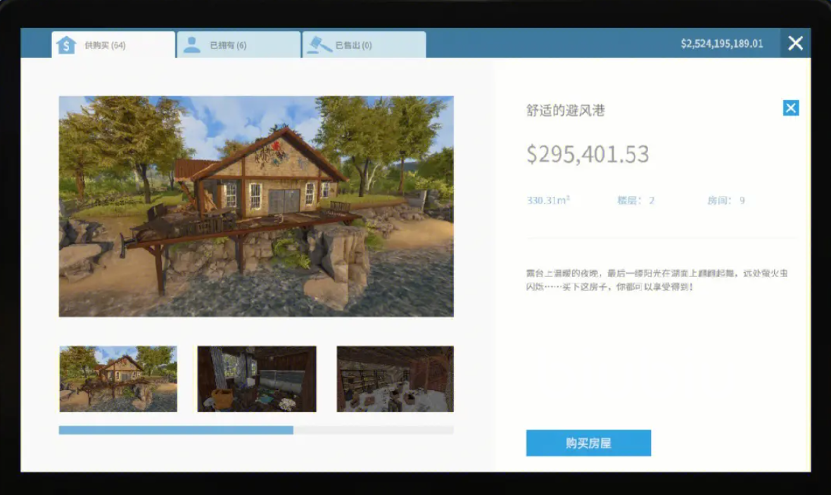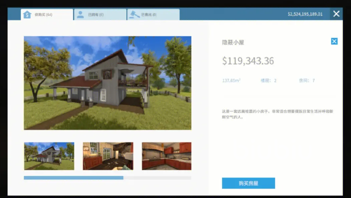 游戏当中买房子跟现实生活当中非常相似,玩家可以自行选择在游戏中的网站上看看自己认为合适的房屋,房屋情况非常不错就可以选择购买了,购买之后,当前房屋就会在玩家的名下,可以供玩家进行各种操作。