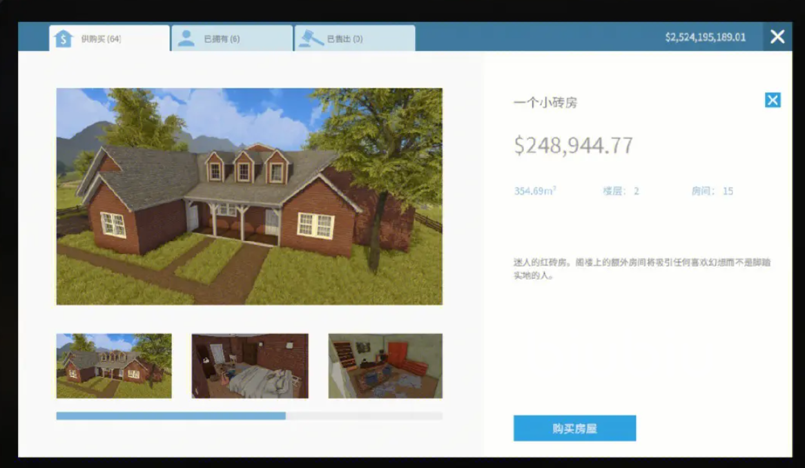买房子的方法是非常简单的,只要玩家手里的钞票够用,点击购买看中的房子,就会成为玩家的囊中之物。