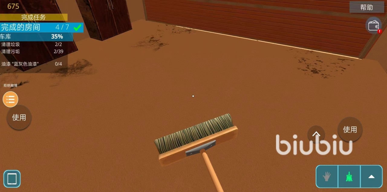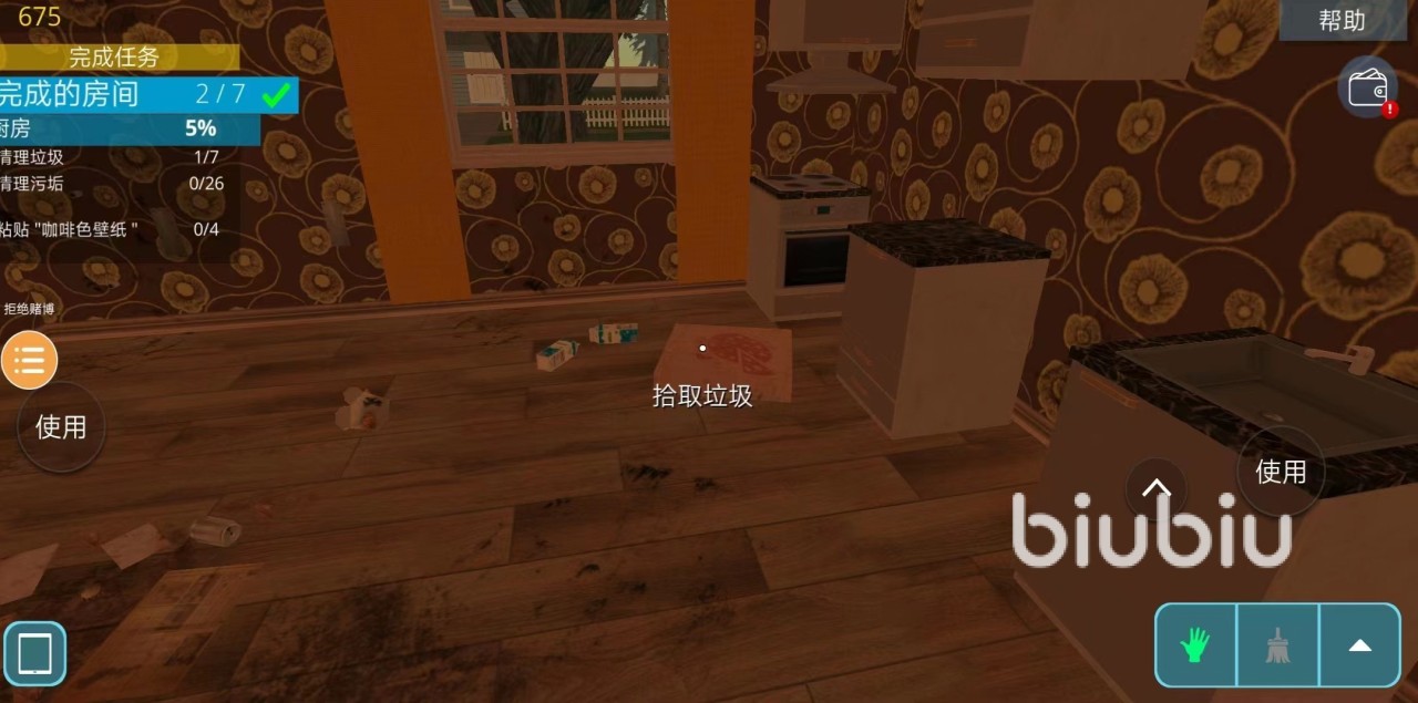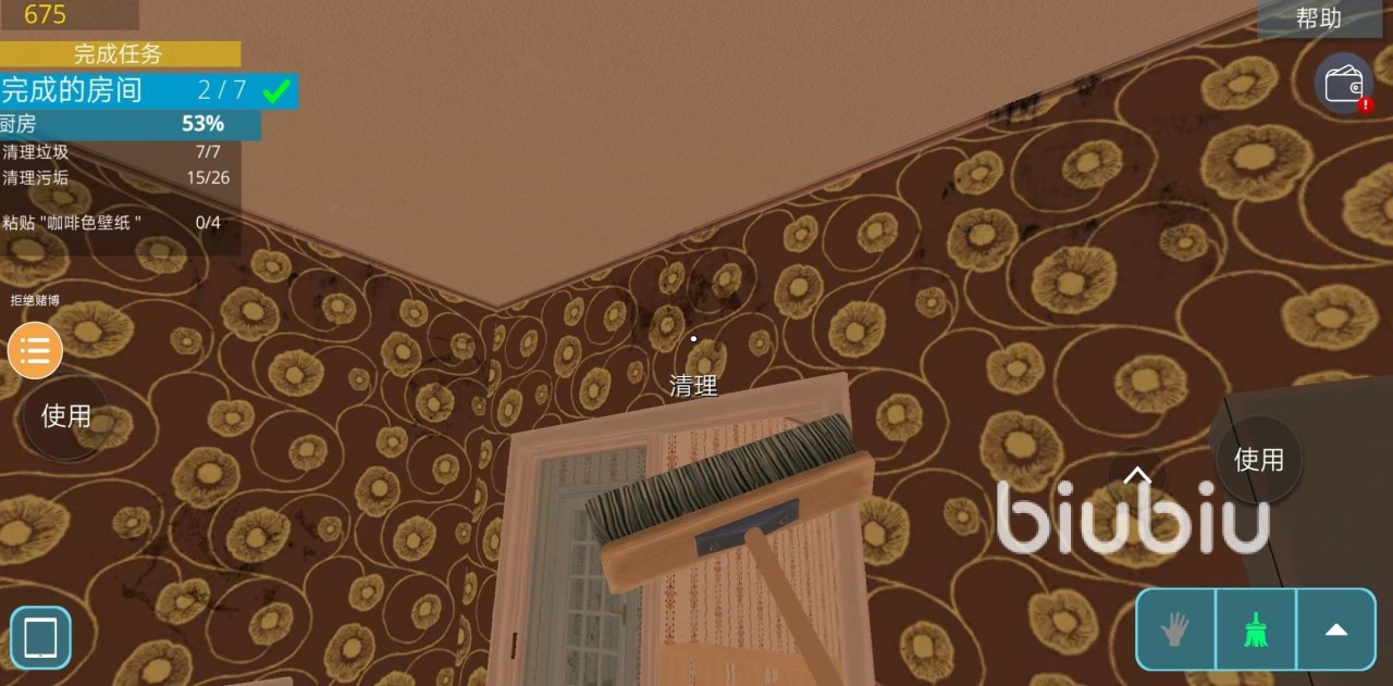 这个关卡一共需要完成7个房间内的清洁,玩家们可以依次打开房间完成每个房间内的任务。大致玩法上和端游差不多,就是没有地图显示垃圾的位置,这个需要玩家们有点耐心寻找下墙面和地毯上的污渍。