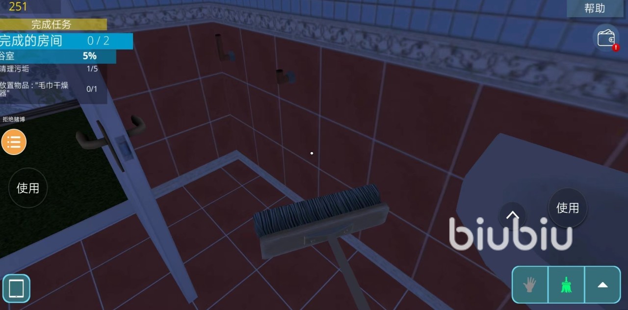 来到门前点击【使用】打开房门,进入房间开始玩家们的清洁工作吧。根据左边的任务栏中可以查看当下房间的任务要求。根据任务要求完成当下房间的清洁即可。