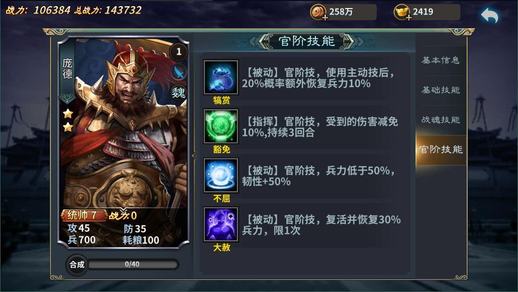 如果玩家队伍魏国的武将较多,还会触发庞德壮侯威名的技能,提高所有魏国武将的防御能力。在战斗的时候,敌人就无法对我方造成有效的伤害。