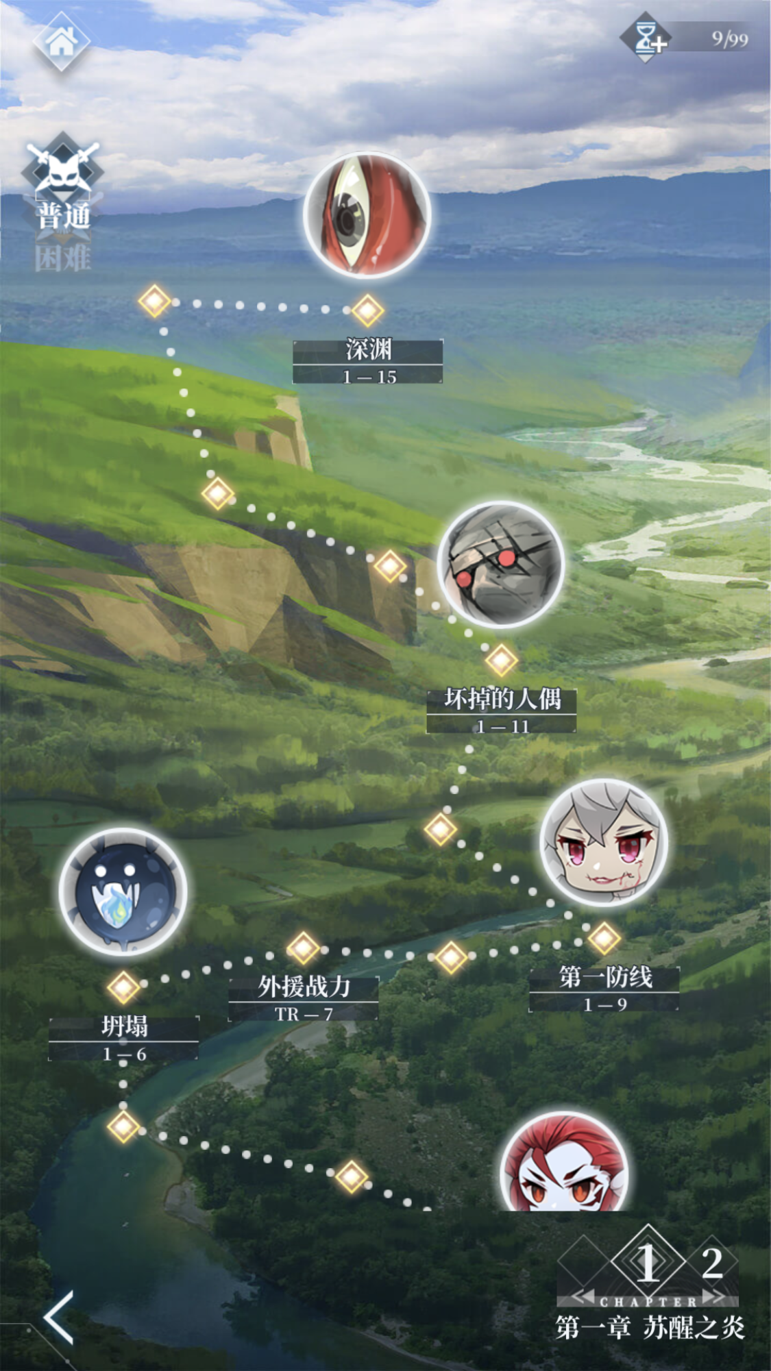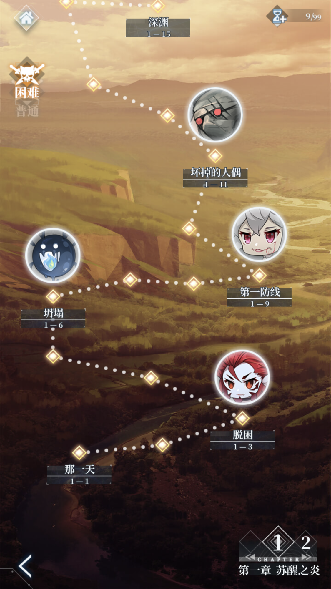 需要通关主线章节的第三章的简单模式,才能解锁第一章节的困难关卡。完成第三章节的通关后就可以回到第一章节页面解锁困难关卡了。困难关卡对战力是有一定要求的,第一章节的困难模式的怪物都是35级的,建议玩家将唤灵等级都提升到35级以上,将特性解锁到三级再来挑战困难关卡。困难关卡一次消耗的行动力也比较高,第一章节的关卡就需要九点的行动力。