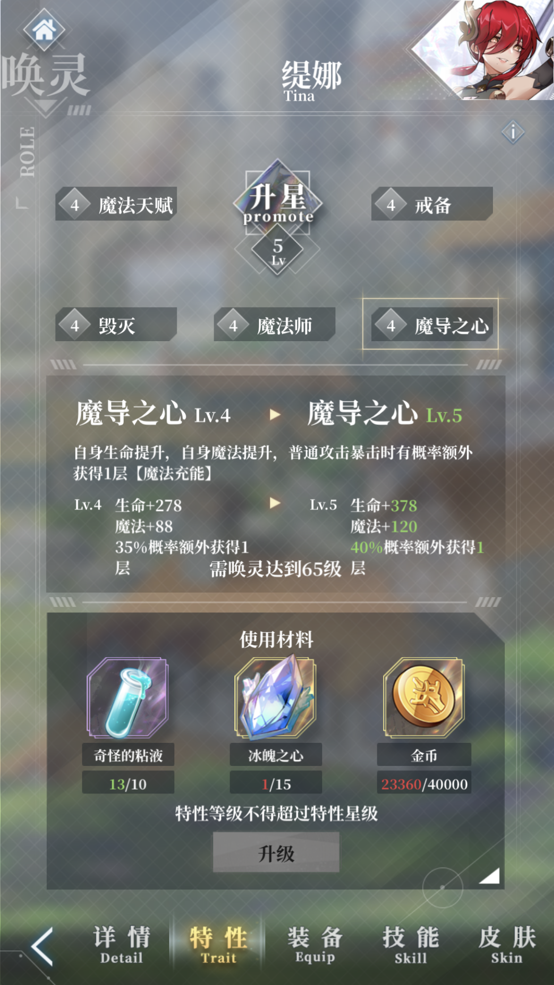 缇娜是一个SR品质的火属性唤灵,她的角色定位是魔法、输出、群攻。从这个定位来看是一个妥妥的传统法师了。传统的法师定位就是高伤害、群体伤害、高爆发。从缇娜的属性面板来看,防御和速度的数值并不突出,生命也是一般,但是魔法的数值是相当高的,幸运值也远高于唤灵的平均水准,以为着有着更高的暴击率。