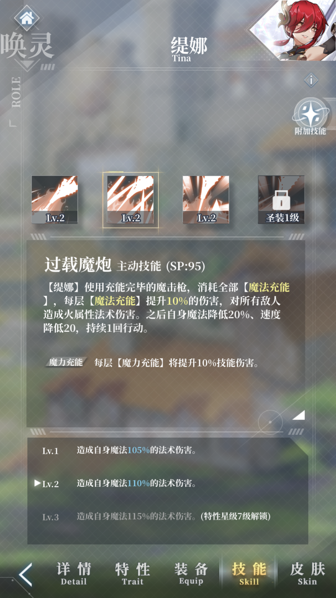 再看看缇娜的技能。缇娜的普通攻击魔力充能与主动技能过载魔炮相互配合构成了缇娜这个唤灵的核心。缇娜的每次普攻都会进行充能,最高可以叠十层效果,然后在过载魔炮中施放出来,每层充能效果增伤10%,如果叠加了十层效果就是100%的增伤,再配合特性拉满后技能本身115%的伤害数值,能达到群攻215%的伤害数值,这是非常高的数值,很多唤灵的单体技能都达不到这个数值。