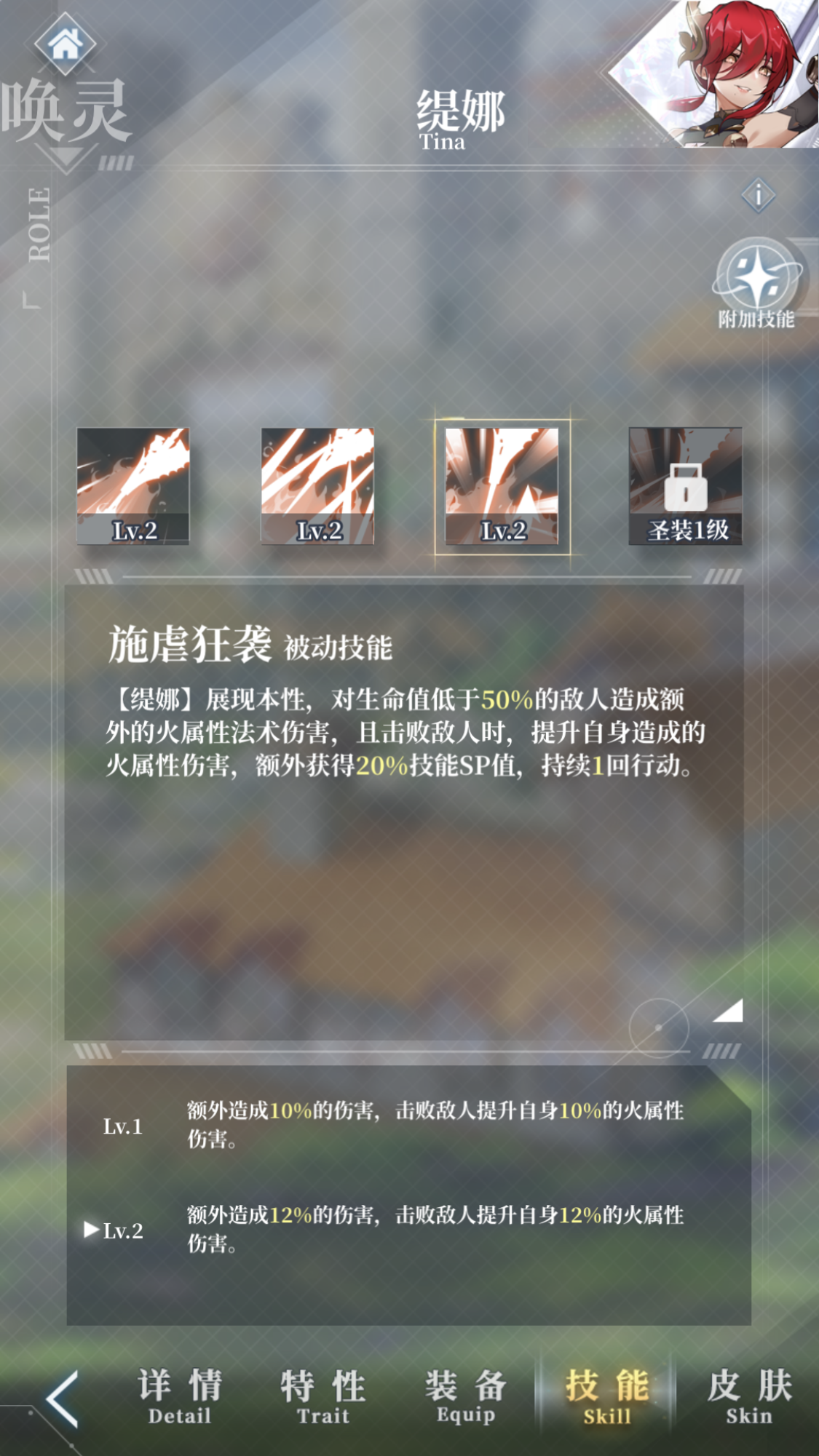 除了普攻的充能增伤外,缇娜的被动技能也有增伤效果,对生命值低于50%的敌方最高能有12%的增伤,收割人头后还能再给自身增加12%的火属性伤害,回复SP值。圣装技能魔导先驱者,在施放主动技能消耗充能时能回复SP值。被动技能和圣装技能,在增伤的基础上,回复SP值,增加缇娜的主动技能施放频率,让炮台效果更强。