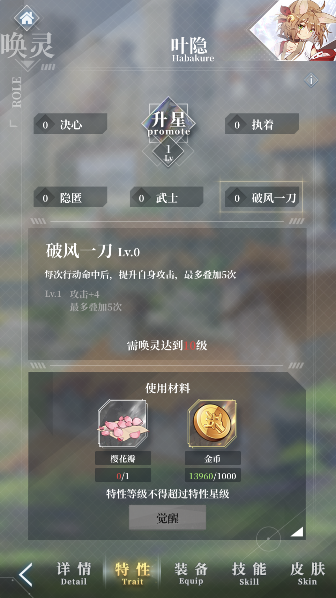 再看叶隐的特性,武士和破风一刀,武士特性加攻击和生命,破风一刀每次行动加攻击,最高叠五层,一级特性叠满是20点攻击,二级特性叠满是40点,这个攻击加成很高。其他的特性,决心、执着、隐匿是增加攻击和生命、闪避的。