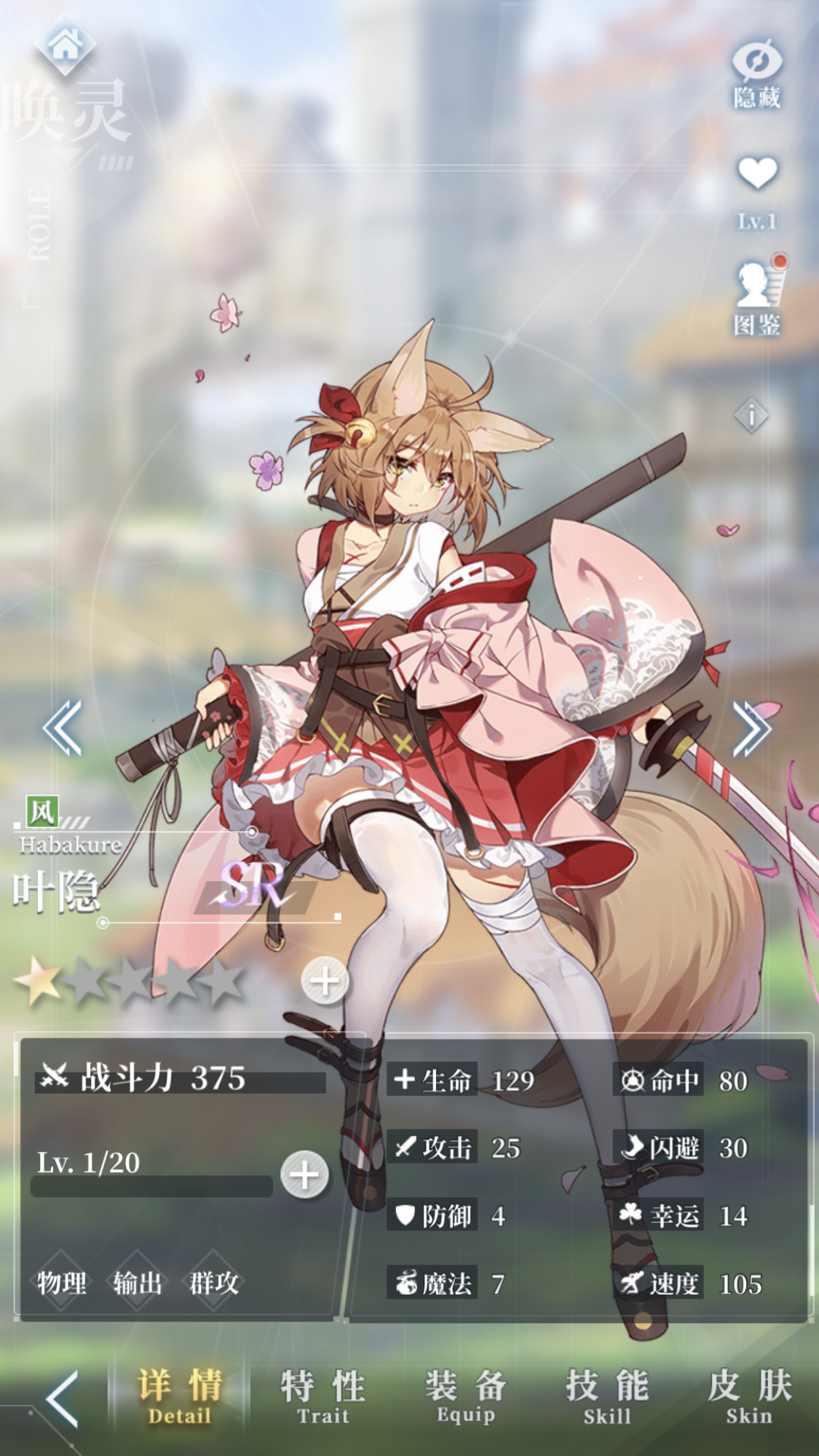 叶隐是一个风系SR唤灵,定位是物理、输出、群攻,是一个纯输出型的唤灵。从它的属性面板来看,闪避要高于其他的唤灵,速度是正常水平,幸运值不高。攻击成长一级提升7点,防御一级提升1点,攻击的提升系数不错。