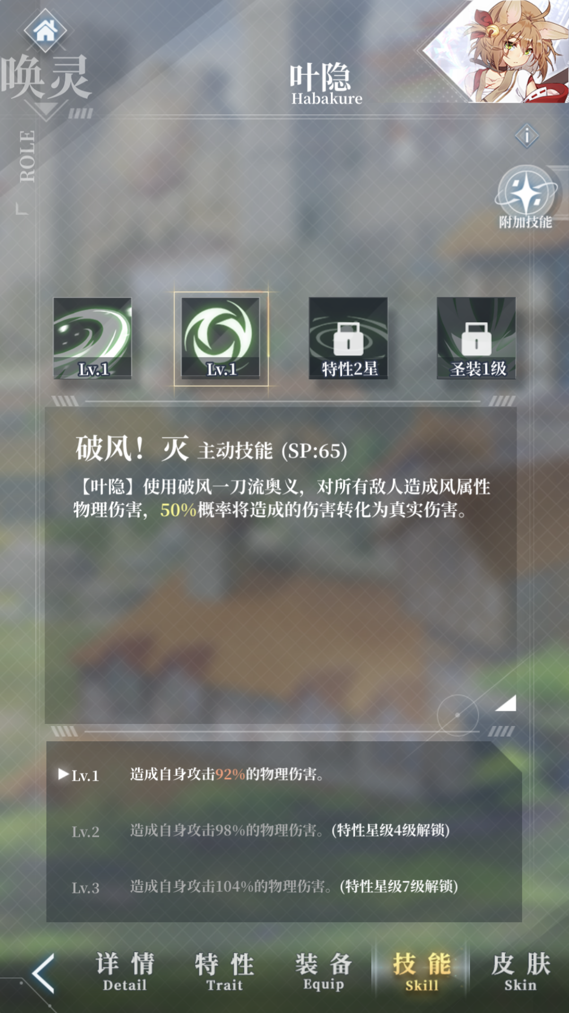 再看叶隐的技能,普攻是单体伤害,数值在特性满级时是110%的伤害,这个数值是很正常的数值。叶隐的主动技能破风!灭,特性满级下104%的风属性物理伤害,这个数值也是正常范围,重点是有50%的概率转化为真实伤害,真实伤害就要比远伤害高的多了,50%的概率是很高的。这个主动技能是叶隐的核心技能了。