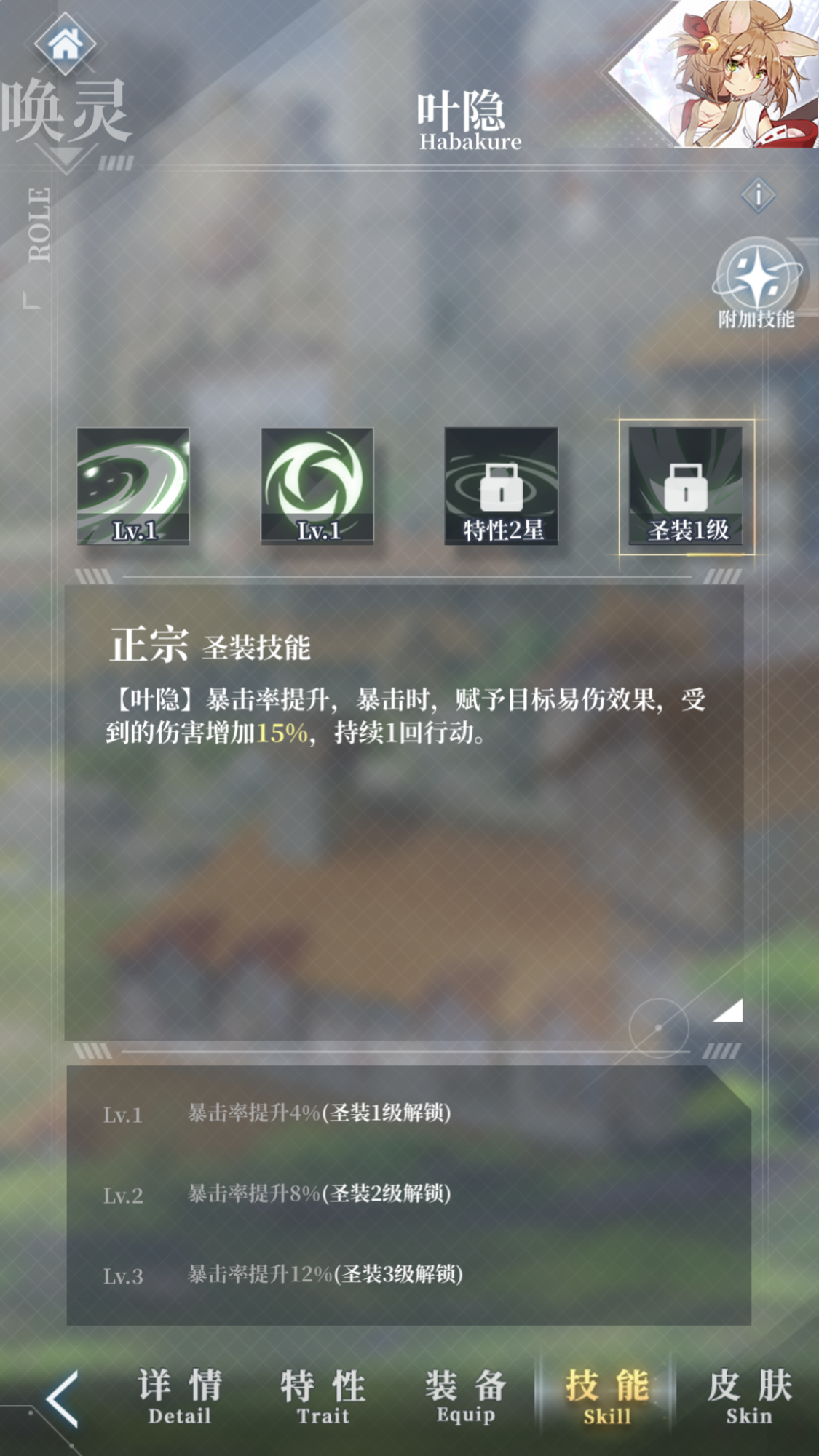 叶隐的圣装技能特性满级下提高12%的暴击率,暴击时能给敌方上debuff,受到的伤害增加15%,这个debuff上了以后己方其他角色攻击也会起到效果,非常实用的技能效果。