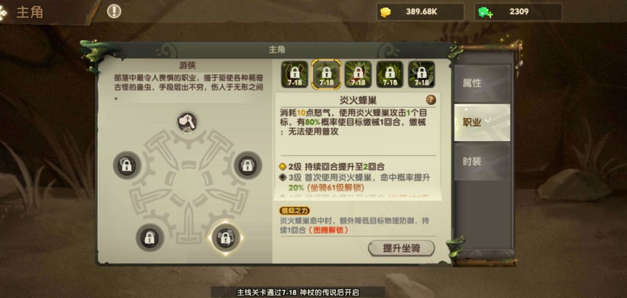 战士职业:战士就是玩家们一进入游戏所拥有的职业,他们在作战的时候,技能都是偏向于伤害类型的,不管是重锤,纵劈,致死打击还是其他的技能,只要有一个强力的物攻宠物加持,他在前期的开荒速度,可以说是五大职业中最强的一个,这也是游戏为什么将它安排为第一个玩家们的初始职业的原因,如果前期就没有开荒的能力,玩家们就会在各种主线关卡中感觉到乏力,就没有坚持下去的必要了,因此前期无论是解锁几个职业,只要没打过8-18关卡就要一直使用战士职业来进行战斗。