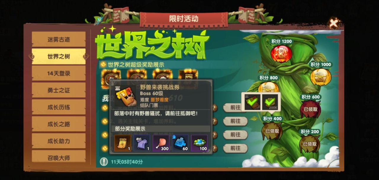 而野兽来袭boss挑战券,则需要在限时活动世界之树里面获取,玩家们需要。通过完成任务,通过主线关卡,探索野兽巢穴,探索遗迹等等方式这样可以获取野兽来袭挑战券了,并且成功抵御野兽的话,获取的奖励除了召唤券之外,还有一个随机的sr级别宠物,外加100个玉贝,60个sr级别宠物碎片,30个迷雾遗迹中的食物。