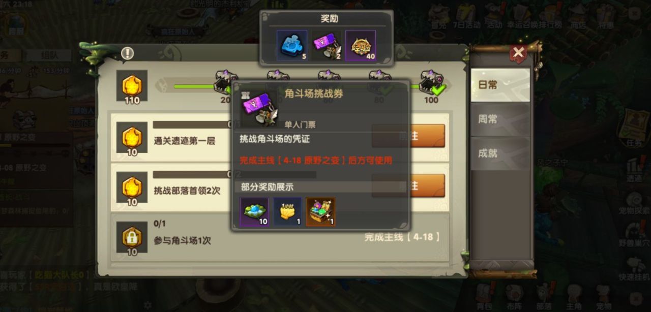 角斗场挑战券可以在日常任务中或者是周常任务中获得,当玩家们的活跃度达到80,就可以获取一张角斗场单人门票挑战券,另外再加五个sr级别宠物碎片,这种单人券在通关主线关卡4-18原野之变之后才可以使用,获取的奖励中规中矩,运气好的话,可以开出来十连抽,幸运召唤券。