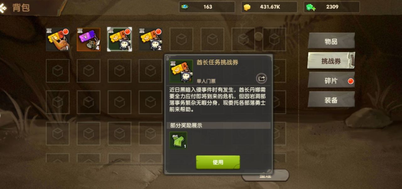 现在在游戏中有专属的任务挑战券,比如说酋长任务解锁挑战券,还有可以直接开启组队挑战的boss挑战券,还有可以开启角斗场与其他玩家单挑的挑战券,最丰富的还是悬赏任务挑战券,可以获取大量的贝壳以及熔炼石。