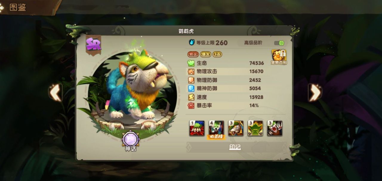守护者状态:这个状态主要是防御属性比较强,我们就可以选择骑狐脸鹿,这样可以增加他的免伤能力,为队伍承担更多的伤害,出战的话,仍然是选择sr级别鹦鹉虎这个万金油宠物,目前版本中最好用的推图宠物。