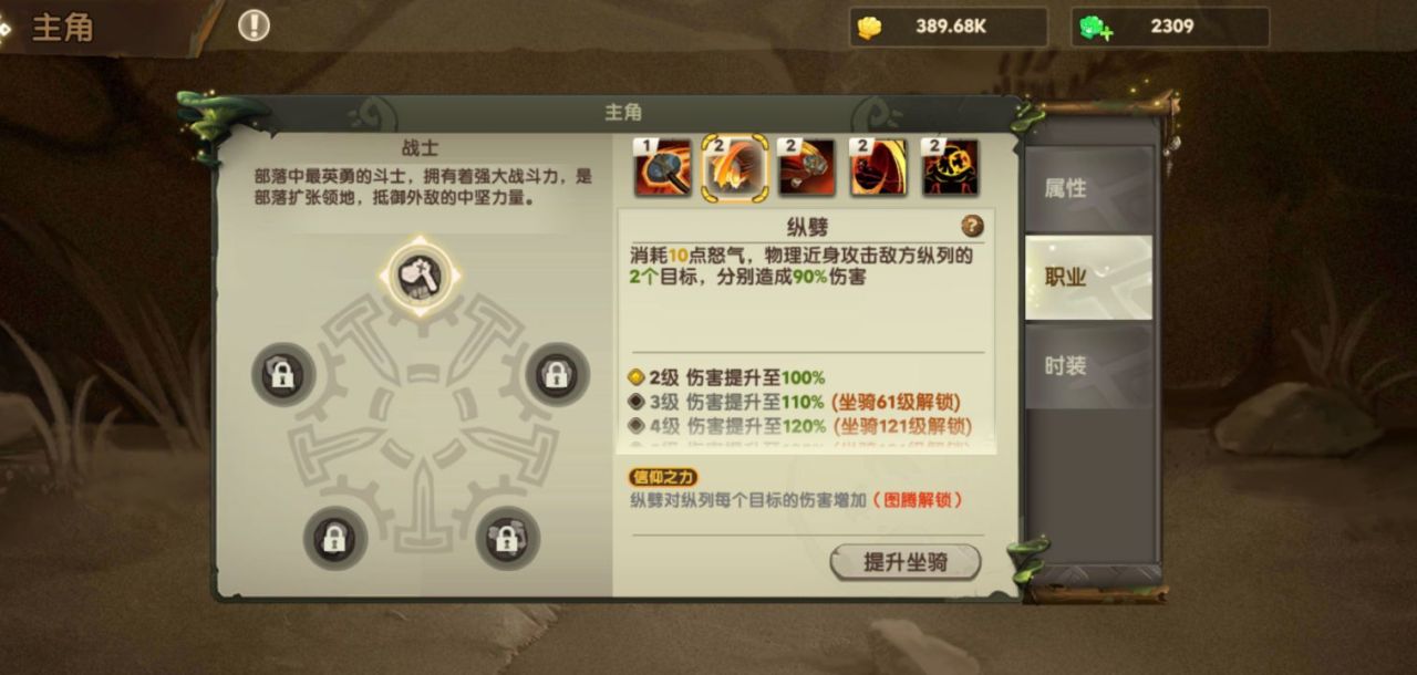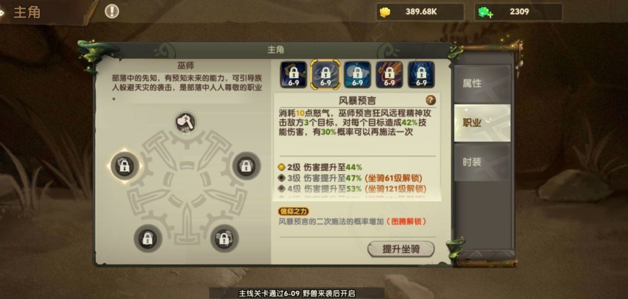 玩家们的初始职业都是战士,通关主线关卡6-9之后可以解锁巫师,通关主线关卡6-18之后可以解锁乐师,通关主线关卡7-18之后,可以解锁游侠,通关8-9可以解锁守护者职业,每种职业的角色技能都是不太一样的,而由于在这个游戏中主角搭配的骑宠才会继承所有的属性,因此每个职业所要出战的宠物,都是不太一样的。