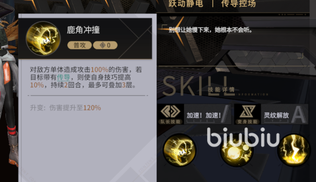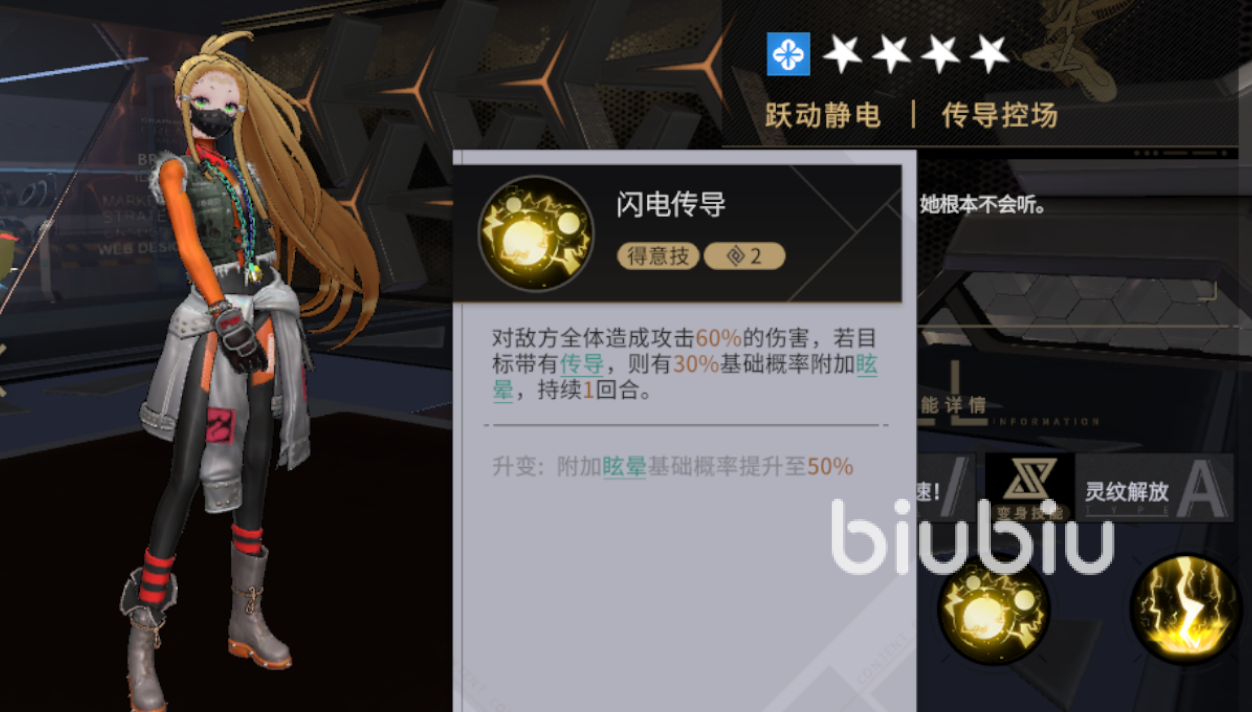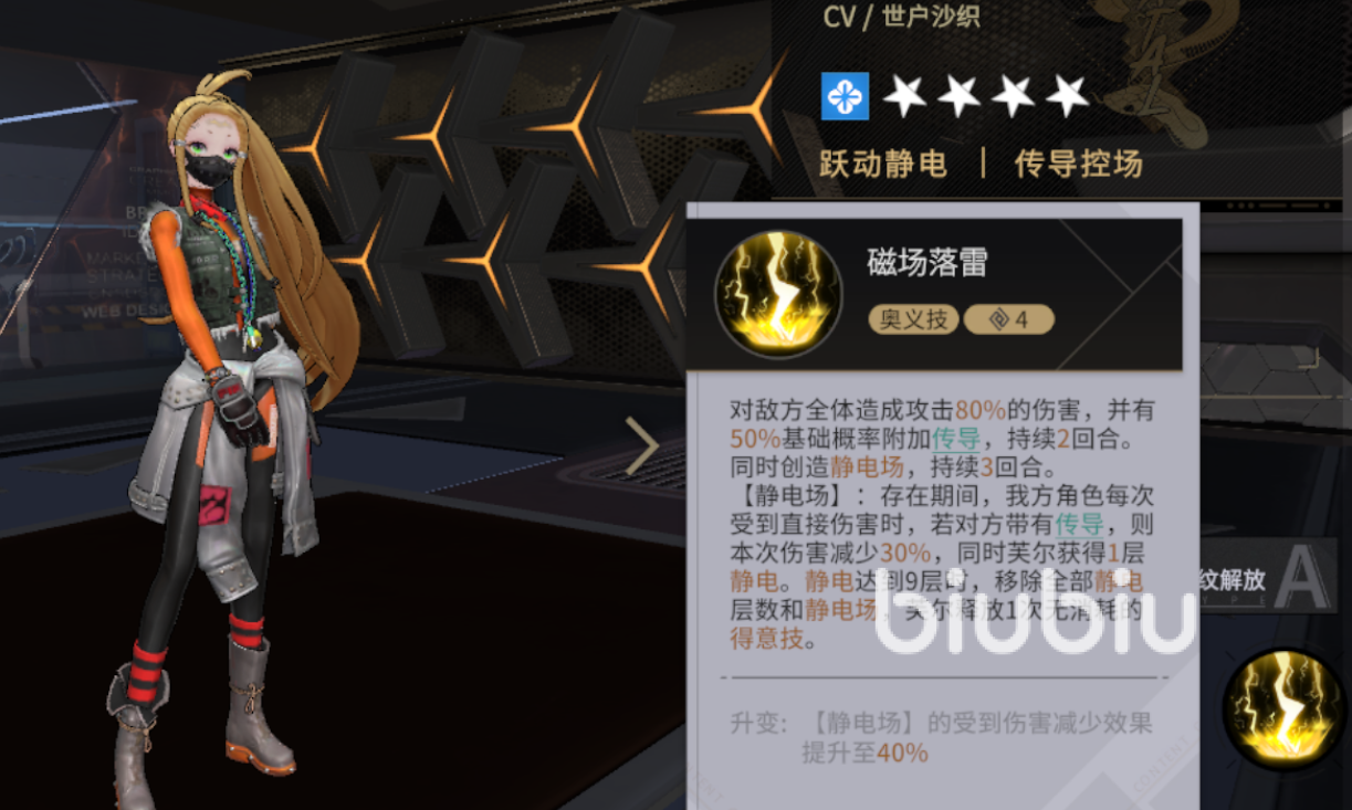 最后是她的奥义技,叫做“磁场落雷”,这个技能可以对敌方所有人员造成伤害,并且有一半的几率附加传导,可持续2回合,还能创造一个能持续3回合的静电场,这个静电场可以让己方人员在被带有传导的敌人攻击时获得减伤,且可以让芙尔获得一层静电,叠到九层的时候就可以无消耗的放一次“闪电传导”。