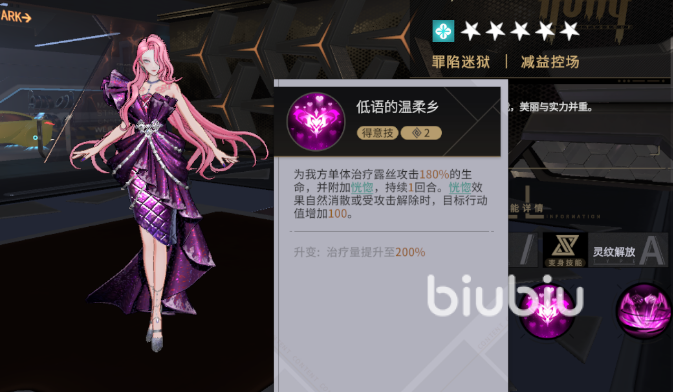 然后是露丝的得意技——低语的温柔乡,这个技能可以让露丝为己方队友进行治疗,治疗量为她自身攻击力的180%,并附带恍惚效果,所以说她的伤害越高治疗量也就越强,除此之外,在恍惚效果自然结束时,被其治疗的目标会增加100行动值。