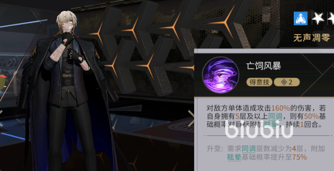 得意技是一个单体伤害,数值高达160%,此外,如果自身有五层或五层以上的同调效果,则有一半的概率会眩晕所攻击的目标。