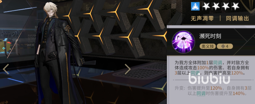 大招不出所料的是一个全体伤害技,基础伤害为百分之百,此外,还可以给包括自身在内的全体友军提供一层同调。