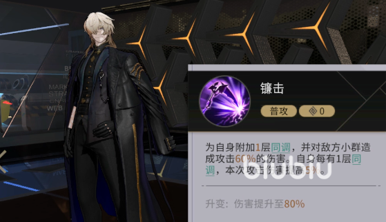 其普攻技能与大多数角色的单体100%伤害不同,他的伤害范围为群体,不过伤害仅有百分之六十,但作为补偿,他的每次普攻都能为自身叠加一层可提升暴击率的同调效果。