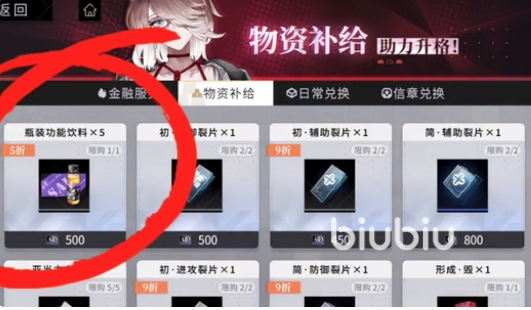 然后就是经验,所谓经验材料其实就是各种的功能饮料,是使用以后可以为角色提供一定经验的道具,可以在游戏内找到“物资补给”,然后在这里进行购买。