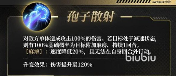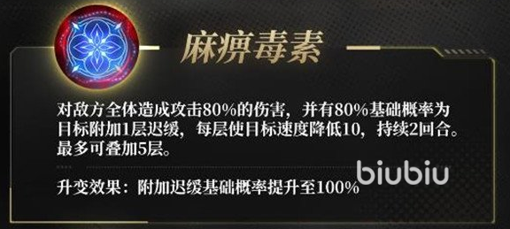 这个角色主要以辅助为主,自身的输出能力不是很强,普攻孢子散射可以对敌方目标造成一定的伤害并且使其陷入麻痹状态,降低20%的行动能力,第二个技能为麻痹毒素,从名字我们就能看出这是一个被动叠加技能,可以对敌方全体目标叠加80%的攻击伤害,并且使其陷入迟缓状态,降低速度10,可以最多叠加五层。