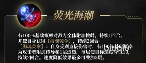最后一个技能为荧光海潮,属于一个挑衅技能,可以在一回合内对敌方全体目标附加条形,并且使自身在受到直接伤害时可以反弹一定的buff,让其叠加一层迟缓,持续时间为两回合,可以让对手的速度大幅度降低,为队友赢得更多的输出空间,除了这些常规技能之外,我们还可以给其进行升变,能让所有的技能实力直接发挥到极致,是各位小伙伴新年的必备角色之一。
