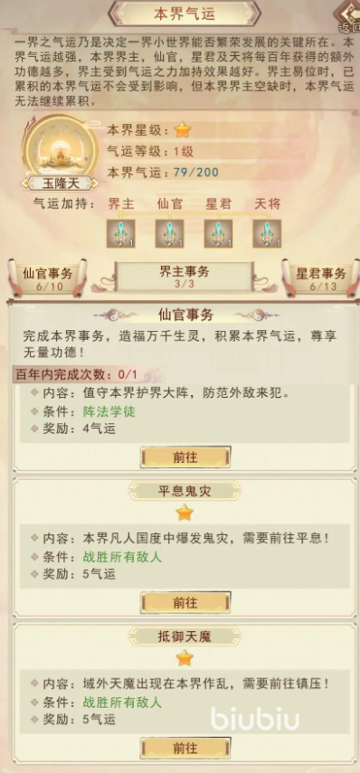并且,当某个地图玩家们成为界主之后,该地图还会开放气运系统。当地图中的玩家们担任给图中各个职位,比如说星君界主等等,每天完成任务便可以获得气运,气运累积到相应数量后,可以永久的提升该地图的官位资源收益,所以,各位玩家们如果实力强劲承担官位执政后,尽量要多做任务,多拿资源。