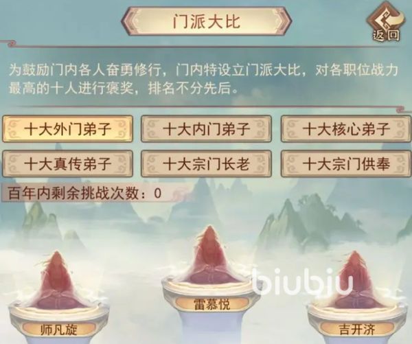 在该玩法中有一个叫做宗门大殿的地方,在这里大家能够看到所加入门派的掌门以及重要的弟子,它是一个负责该门派职务的地方,职务的高低主要是按照贡献点以及境界来进行提升的,门派贡献值达到一定数量之后,就可以进行申请,还可以挑战掌门哦。