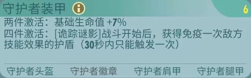 守卫者装甲:守卫者装甲本身可与银衣怪客开启羁绊特效,为怪客提高生命值。在PVP 作战中,怪客极短的冷却,会在敌人第1回技能未解放时突袭到敌人后侧开展攻击并带来4.5秒的缄默,我方只要在第1回技能中搞出巨额伤害便可。