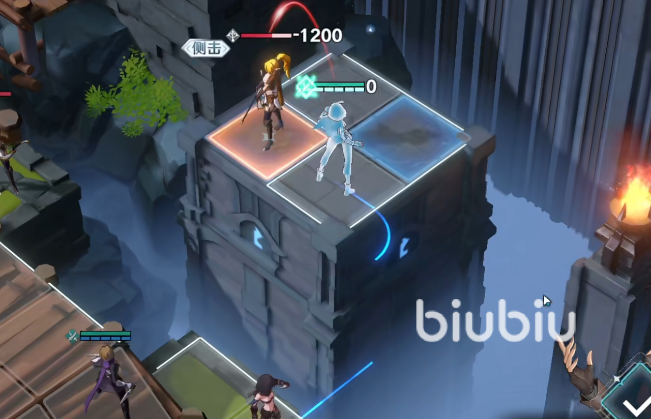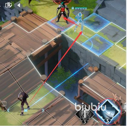 1、进入关卡时,第一回合是我们先起手,我们首要做的就是利用周围的地形,把敌人推入悬崖下面去;如上图所示,直接用兜帽女移到塔上的敌人,对她进行进退之刃,然后敌方掉入悬崖而致命。