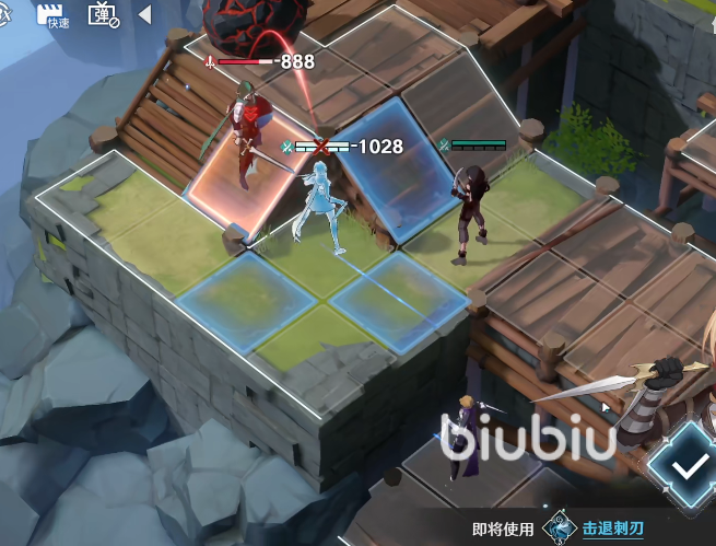 3、然后轮到敌方的回合,但她们都已经掉入悬崖,却无法行动了。这时候就切到我们的回合了。现在直接用兜帽女直接前移到敌人旁,使用击退之刃的技能,操作如上图所示。