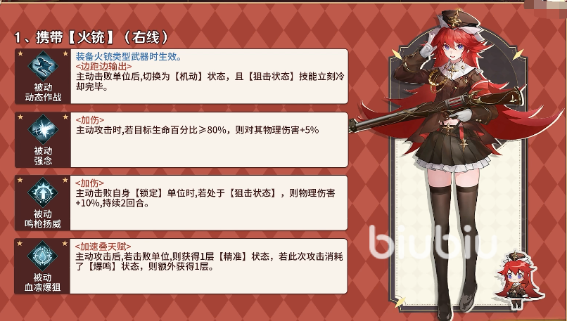 另外,与西撒同时登场时候,她还将获得能够斩杀残血的连携技能,所以收割能力也算不错。当然,她弱势的地方也有,那就是在没切换为狙击形态时,对于血量多的前排没法造成很大威胁,不过在装备火铳武器后所提供的一系列被动增伤完美了弥补了这个弱点。