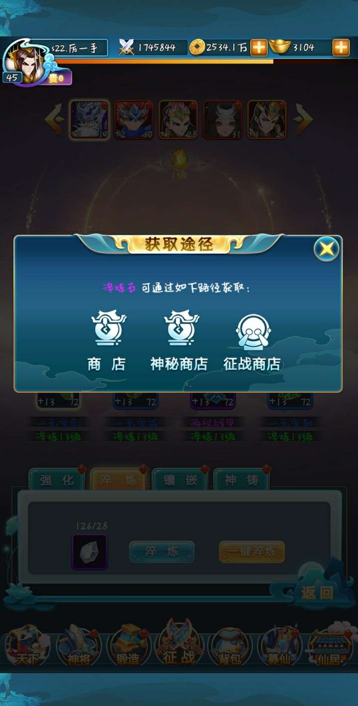 2. 淬炼石可以通过商店、征战商店、神秘商店来获得,在仙盟的坊市中也可以每40贡献值可以兑换一个淬炼石。