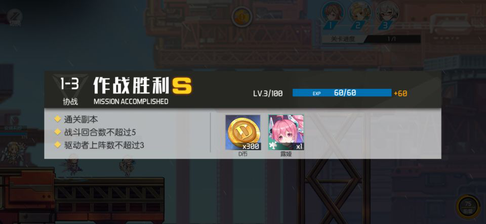 轻轻松松击杀三个,只用了第一波的两个驱动角色,最后再通过一小段剧情结尾,这样这一关我们就成功通过了。