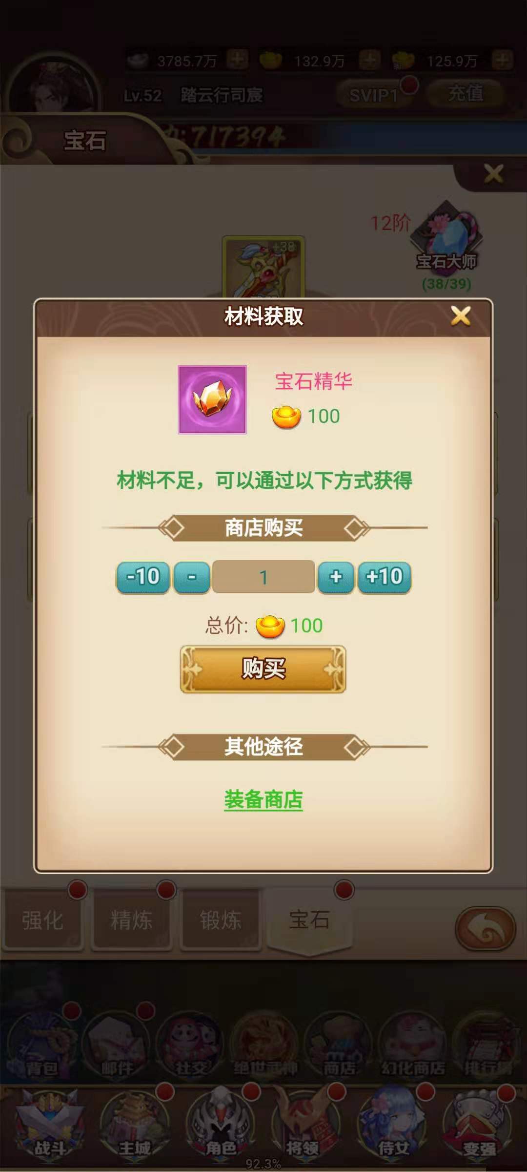 装备镶嵌宝石只有一种那就是攻击宝石,升级镶嵌等级可以获得攻击力加成,升级镶嵌需要消耗的是宝石精华,宝石精华最方面的获取途径就是直接元宝购买了。如果元宝不够的话就需要在其他方面找一找了。除了购买之外,可以获得宝石精华的途径有宝石副本,蜀道难,名器特惠,军团商店兑换,演武商店兑换等。