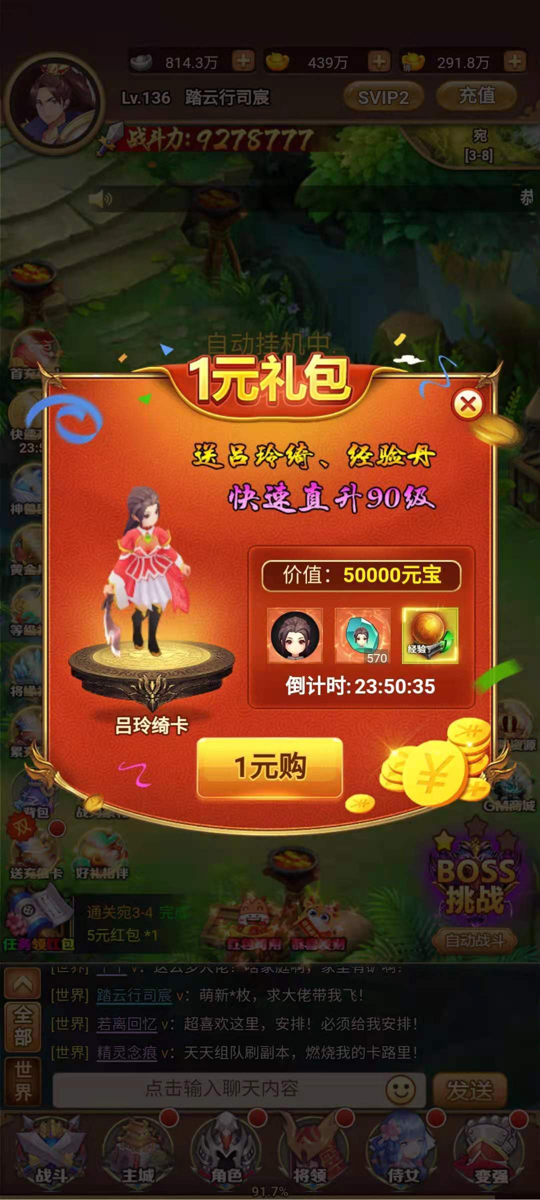 在飞升三国中升级并不是一件轻松的事情,单凭自动战斗的经验是根本不够的,后期升级经验动辄几十亿,所以必须找到快速获取经验的方式。当刚进入游戏的时候,系统会给予我们一个升级大礼包,点击界面上的快速升级按键就可以看看,只需要花费1元,就可以购买到升级大礼包,其中有经验丹可以让玩家从40级直升到90级,这样前期最困难的时候就直接过去了。