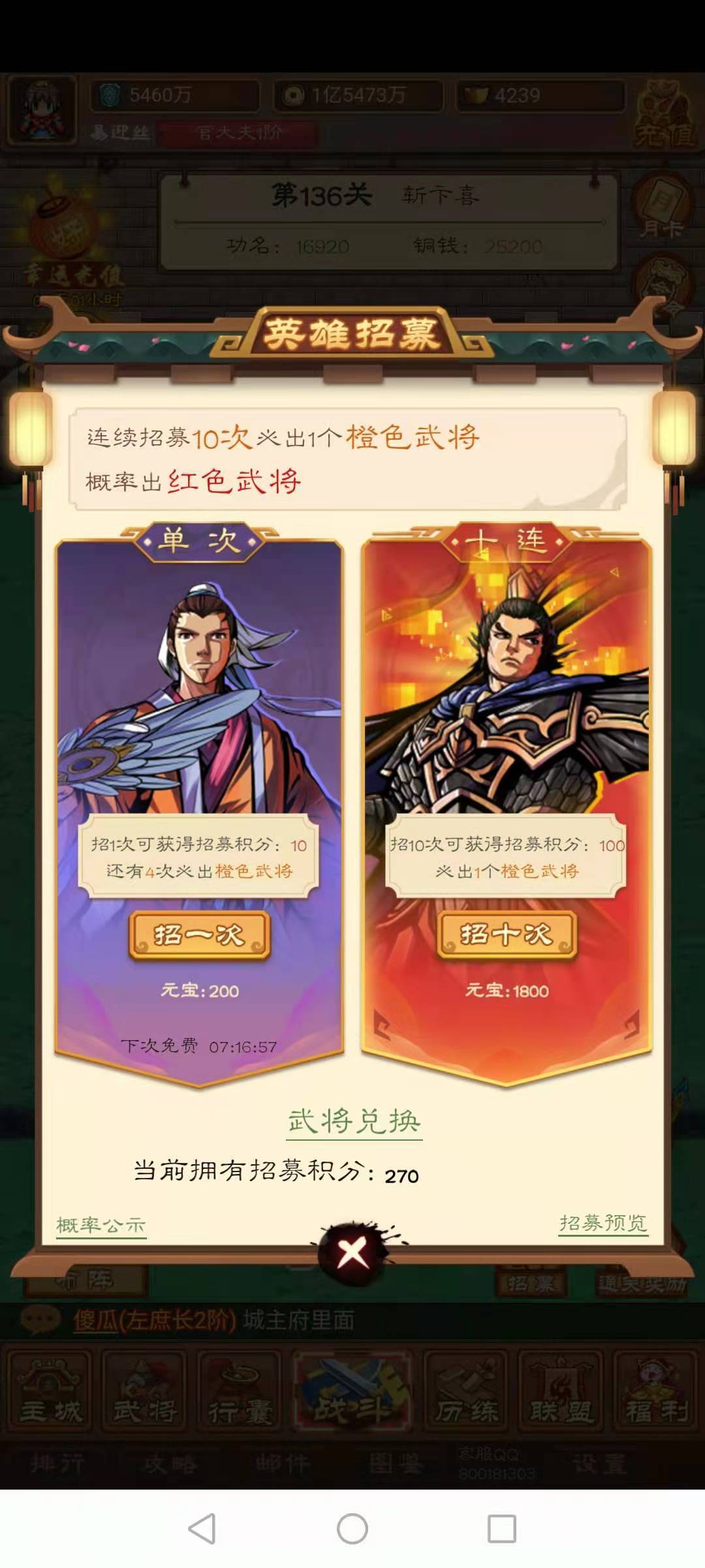 如果仅仅是看招募概率的话,获得红色武将的几率是比较小的,但是招募还有一个好处就是获得招募积分,每次单招能获得10分,一次十连抽就是100积分。招募积分可以兑换红色武将的整卡,其中有关羽,黄月英,周瑜等极品红色武将,600积分可以兑换一个,也就是说6次十连抽必定能获得一个红色武将。