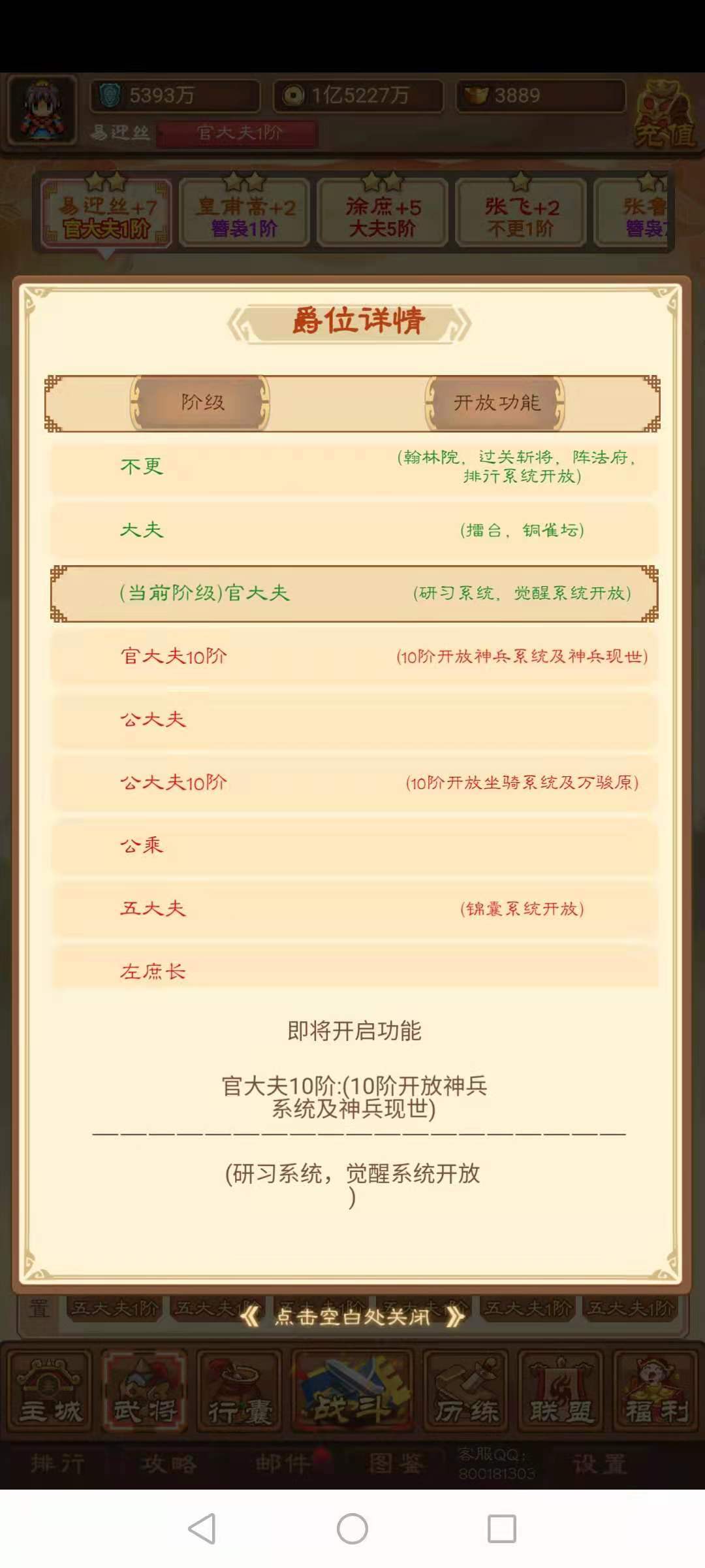 沙盘推演是在主城中消耗粮草进行的活动,活动中每走一步都能获得一些功名和铜钱,一些特殊关卡获得的还会更多的功名和其他奖励。功名有了之后,点击武将中的想要提升官阶的武将,在右边就有一个晋升的按键,点击就可以晋升一级官阶了,每类官阶都分为10个小层次,小层次点满之后就能晋升一个大层次。