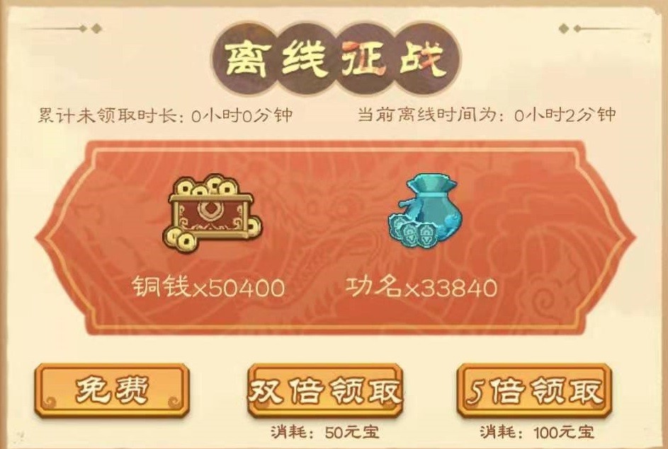功名的获取途径有日常战斗,沙盘推演,等两大途径,日常战斗又分为普通战斗和BOSS战斗,在凤舞三国中普通战斗是自动进行的,也就是无论是玩家是否在线,都可以持续累计功名。然后在上线之后,玩家可以一次性收取离线期间内积累的功名,收取的方式有免费收取、双倍收取和四倍收取。其中免费收取是有多少就收取多少,双倍收取和四倍收取是额外多收,但是需要消耗元宝,前期因为我们继续功名来提升官阶,所以建议大家选择双倍收取。