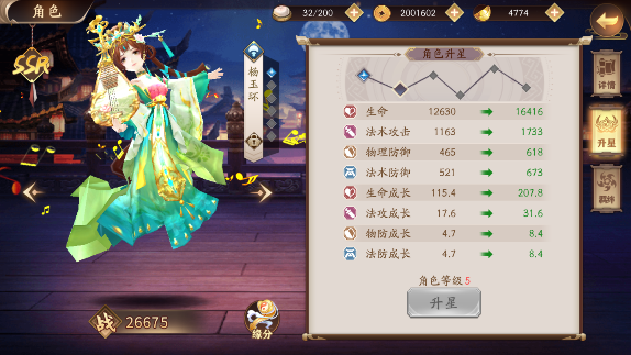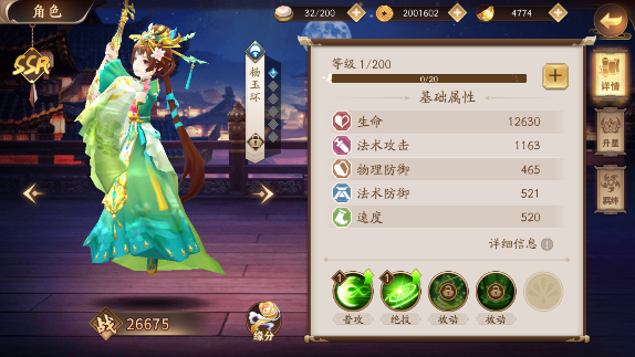 2、技能分析:提升技能可以加强伤害,以及附加的暴击等级。和大多数的辅助角色一样,后期想要做到高暴击率是少不了杨玉环这种角色的。