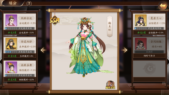 1、缘分:纸醉金迷(物攻提升+1.5%)、恃宠而骄(生命提升+2.5%)、能歌善舞(物防提升+1.5%)、蕙质兰心(法防提升+1.5%)、音问相继(精准+465)。