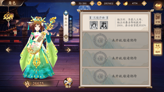 2、羁绊:羁绊效果兰陵序曲,杨玉环、李裹儿上阵杨玉环暴击等级提升2000,暴击伤害提升20%。