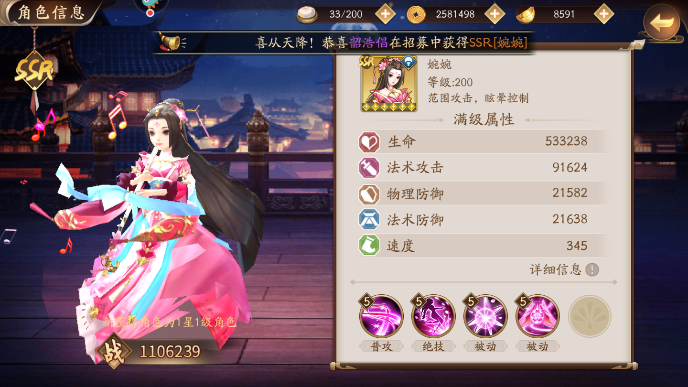 2、角色评价:婉婉的眩晕几率是比较低的,不过婉婉时游戏中性价比最高的SSR,几乎不用抽卡就能做到满星觉醒。