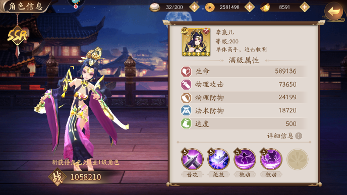 2、角色评价:李裹儿是SSR角色中爆发最高的角色没有之一,李裹儿的收割能力也非常强,配合群攻的后排角色,可以最大程度发挥其特性。